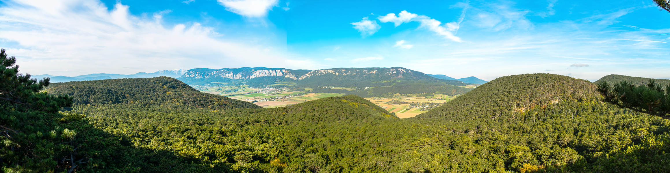 Nordwestliches Panorama vom Engelsberggipfel mit Schneeberg und Hoher Wand.