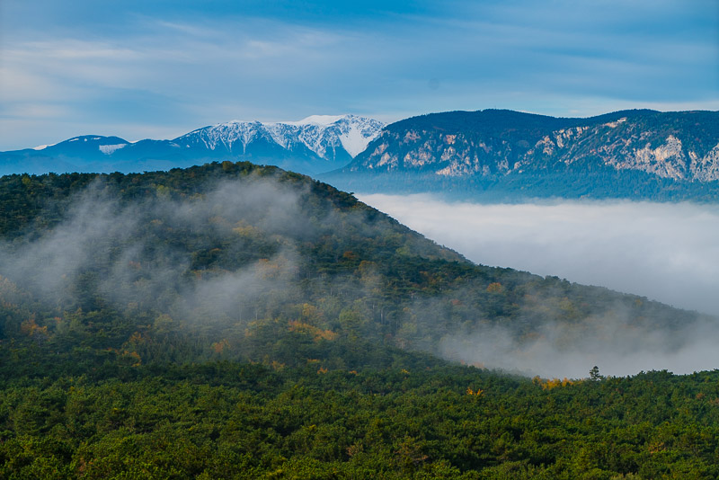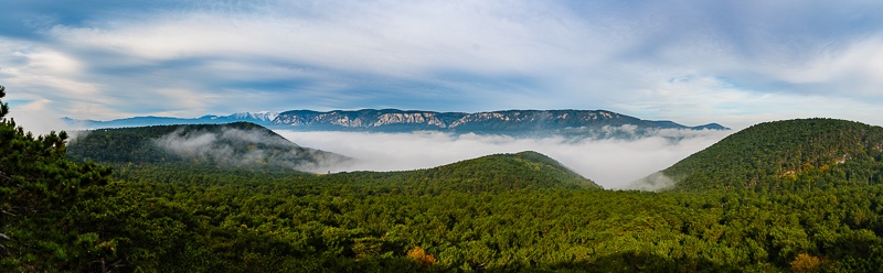Panoramic view to Schneeberg and Hohe Wand, as seen from the Engelsberg. Click here or into the picture for a larger display.