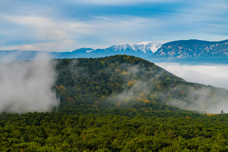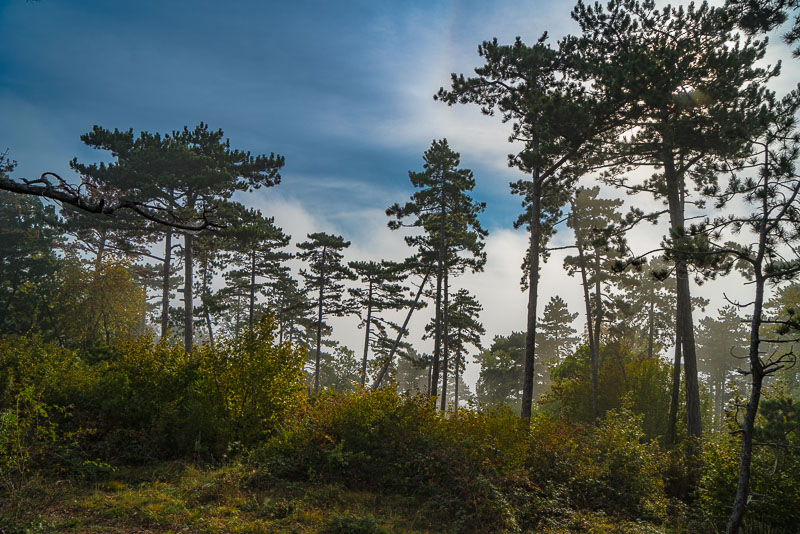 Two of Winzendorf-Muthmannsdorf´s communal councillors are intersted in building an observation tower in den Fischauer Bergen. As I was here 4 1/2 years ago to explore the terrain for this purpose, I was asked about this, and so I am on a walk up Engelsberg with two companions. Dense mist is covering everything up to the summit, but after a few minutes´ discussion on the summit, all of a sudden, the mist disappeared and permitted a view to Schneeberg and Hohe Wand - the view to the other side would require the observation tower.