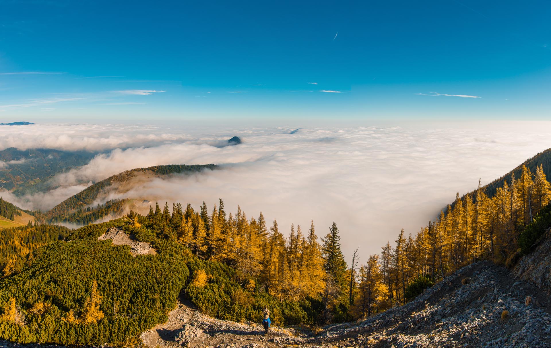 Blick vom Fadensteig zum Fadensattel und über das Nebelmeer nach Norden bzw. Nordosten.