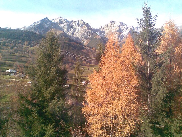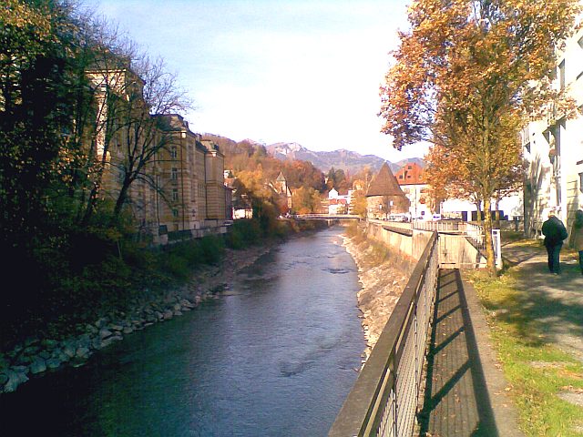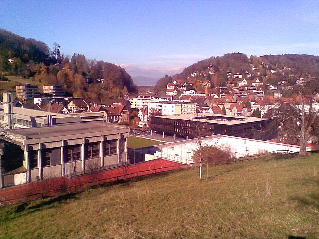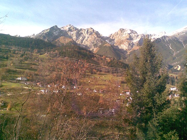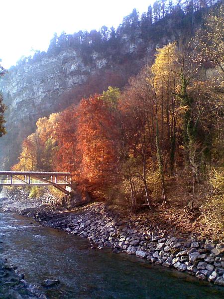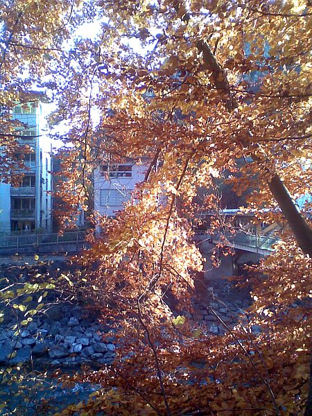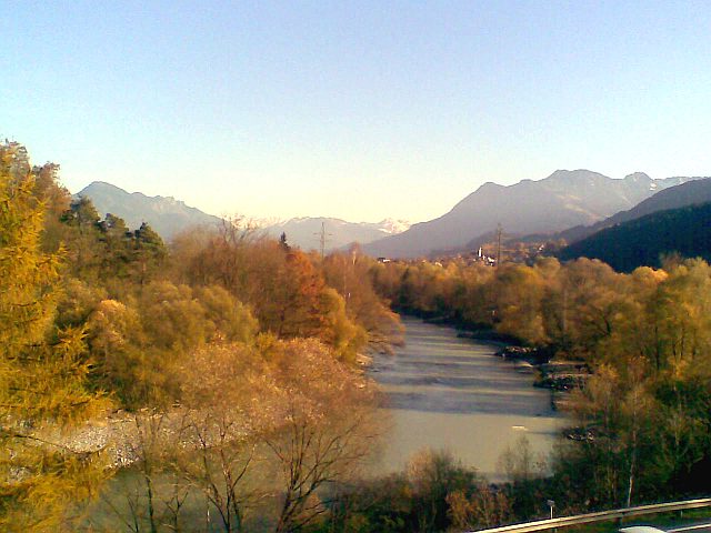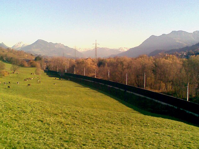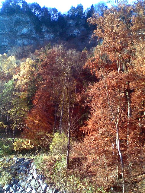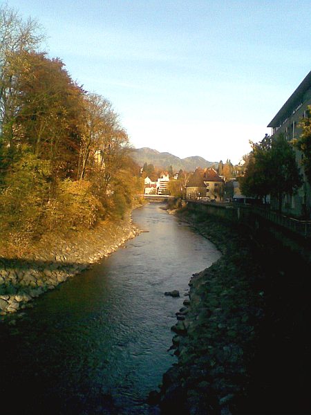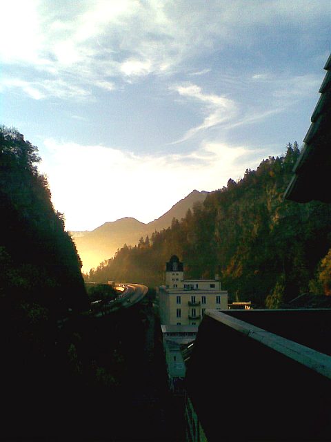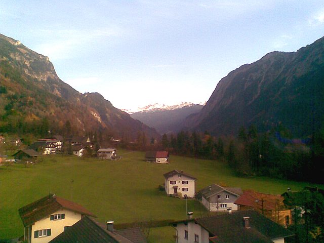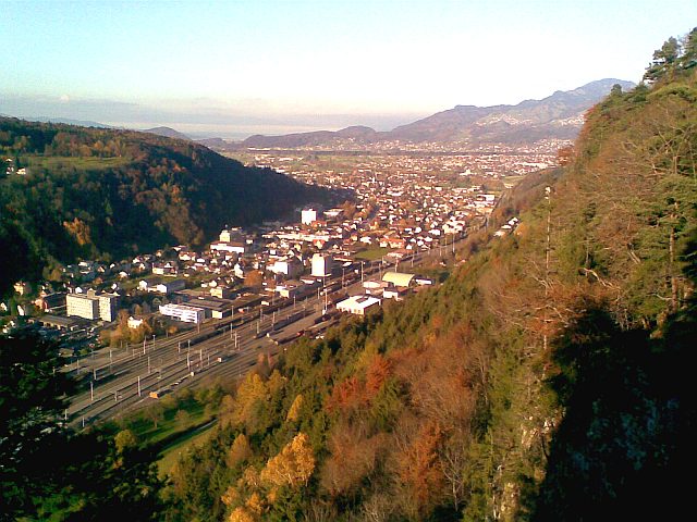 Freitag 5.11. am Morgen. Ein herrlicher Tag kündigt sich an. Blick aus dem Fenster meines Hotelzimmers im 6. Stock. Bei Feldkirch zwängt sich die Ill durch ein ganz enges Tal mit steilen Berghängen auf beiden Seiten, die oben in senkrechte Felswände übergehen.
