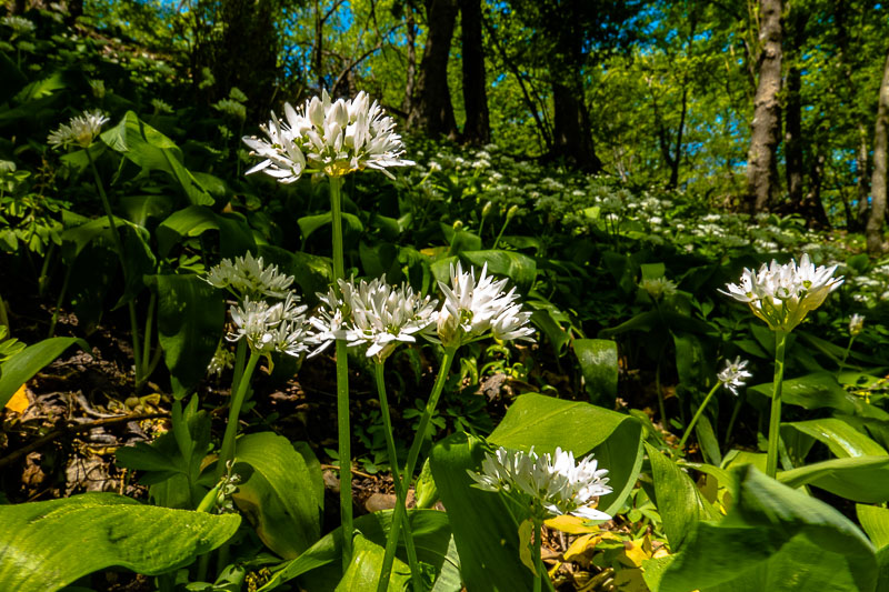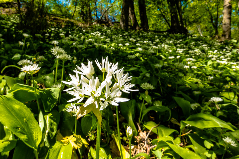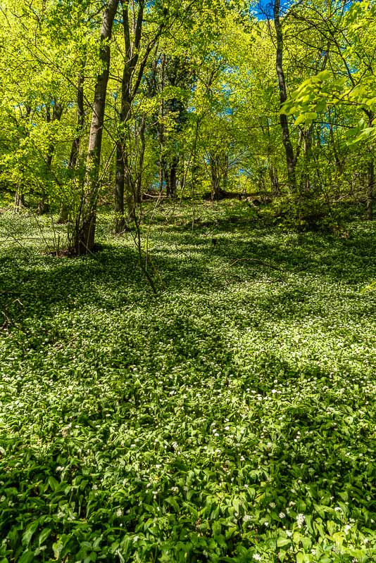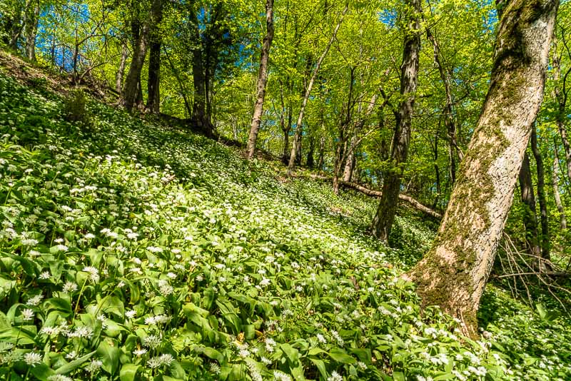 Im Wald Richtung Hoffmannshöhle finde ich einen schattigen Abhang voll mit Bärlauch (Allium ursinum).