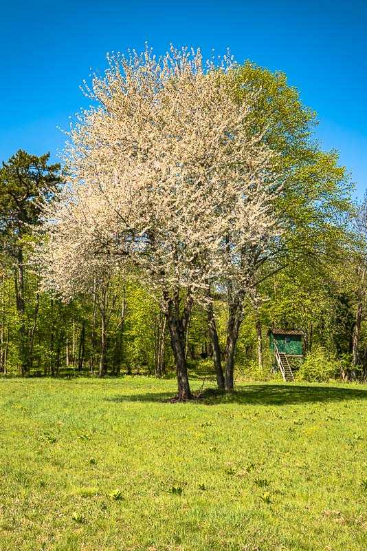 Auf der Wiese blüht ein einzelner, riesiger Kirschbaum