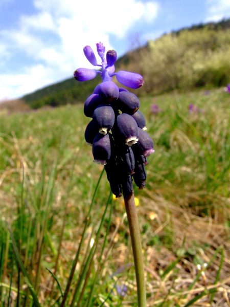 In between a few grape hyacinths (Muscari botryoides)