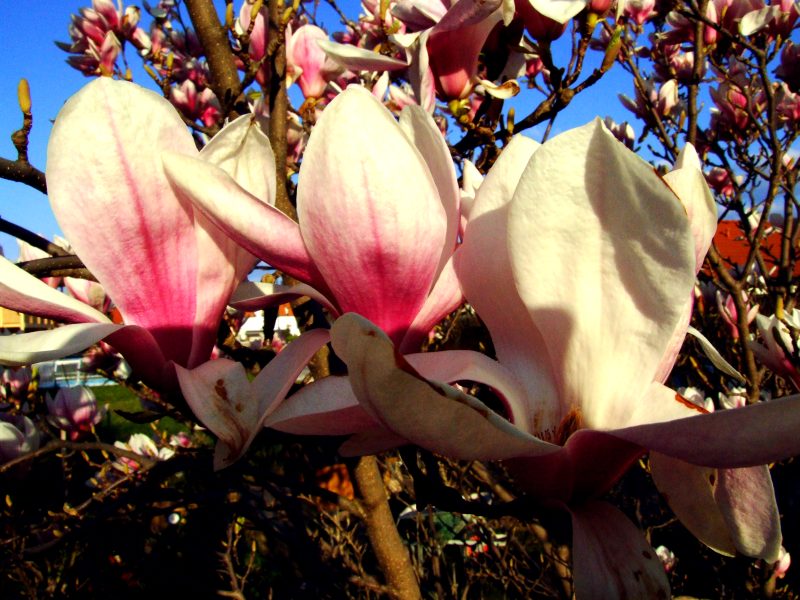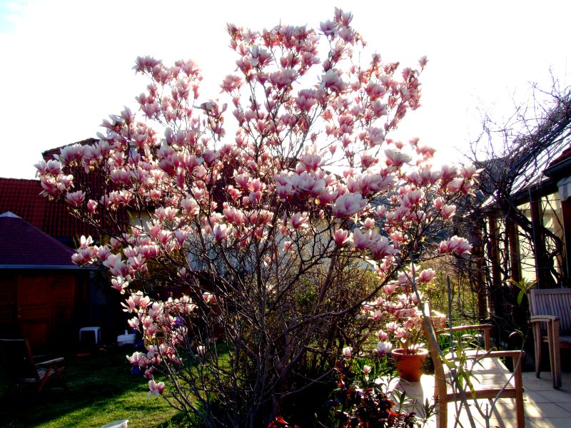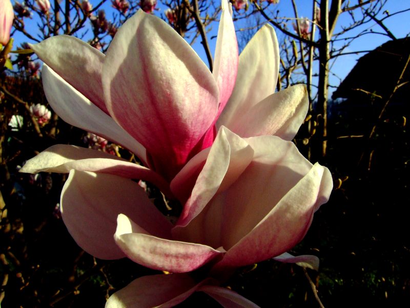 In the evening, at home in my garden. The last sun rays cast a beautiful glare on the magnolia, which was not damaged by frostz this year.