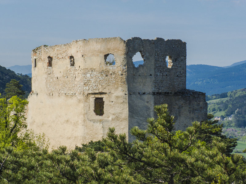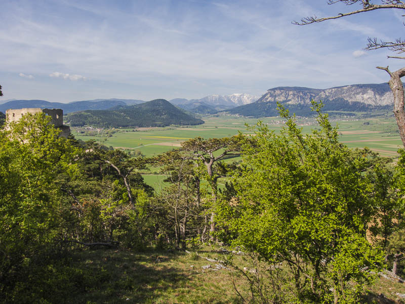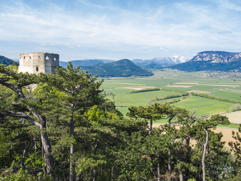 Ruine Emmerberg, Schneeberg, links vorne flankiert vom Kienberg, rechts die Hohe Wand.