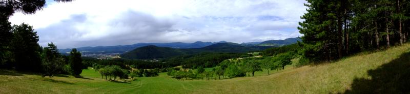 First, a few pictures of yesterday´s walk to "Schoene Aussicht" ("Good View") near Winzendorf and back over Mitterberg: Panoramic view to Hohe Wand, Schneeberg far left. Click into the picture for a larger version.