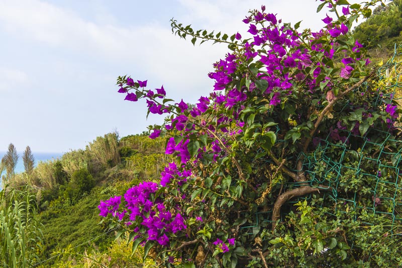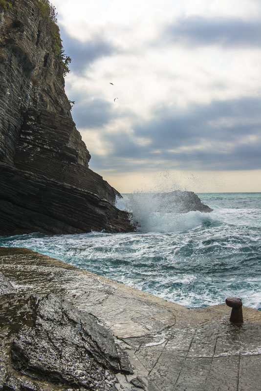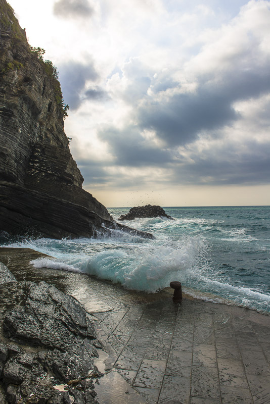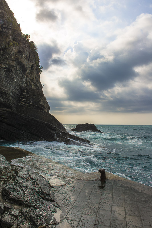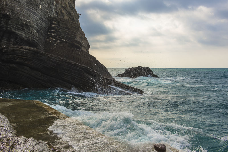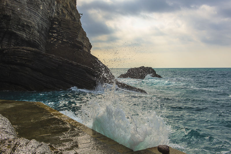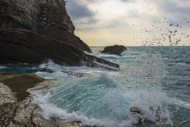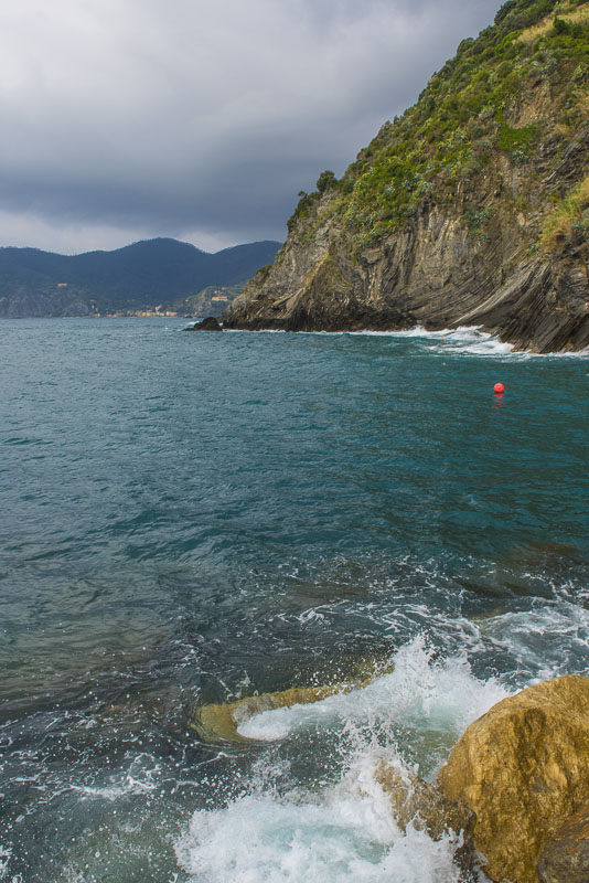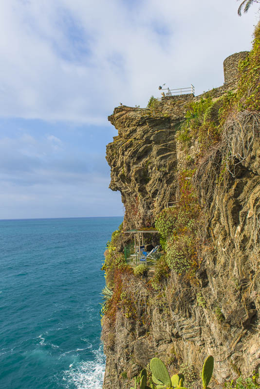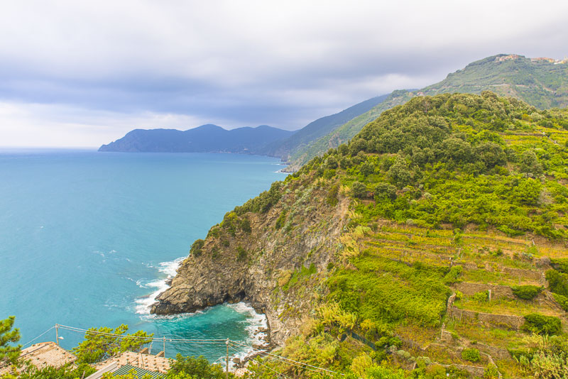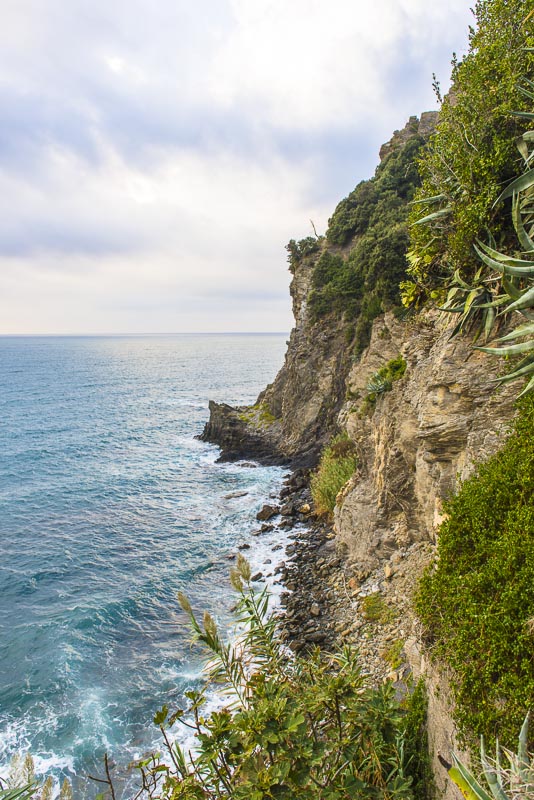 Steilküste unter dem Ort von Corniglia. Als einziger der Cinque terre hat er keinen direkten Zugang zum Meer, sondern liegt auf einem Felsen.