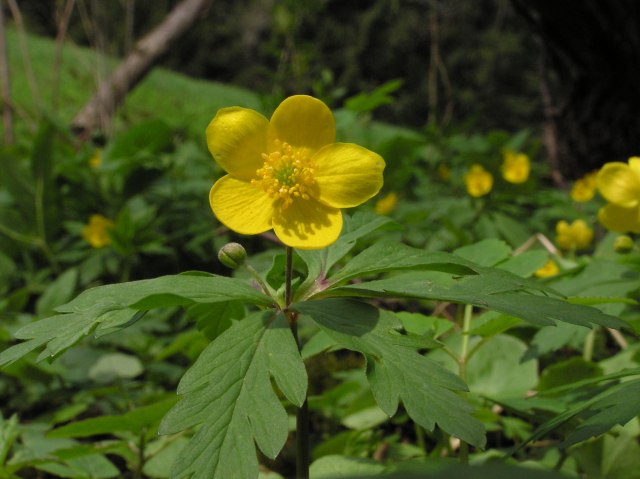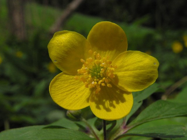 Yellow wood anemone with its second blossom not yet open