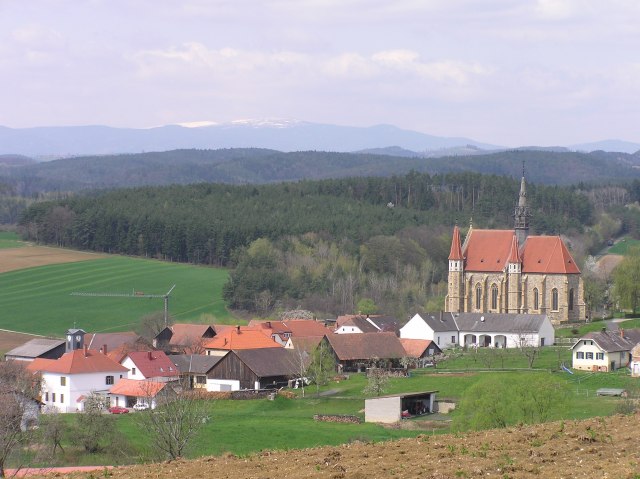 On the way back: View to snow covered Hochwechsel with Mariasdorf in foreground. The church was built in 1400