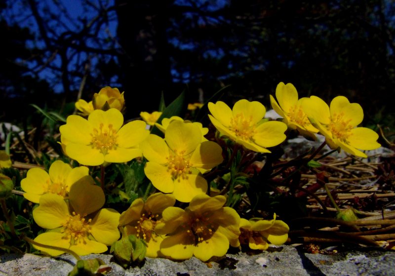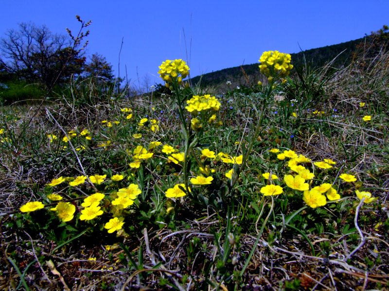 Weitere hübsche Frühlingsblumen zieren das Gras: Das niedere Sandfingerkraut (Potentilla arenaria) und das höhere Berg - Steinkraut (Alyssum montanum), ...
