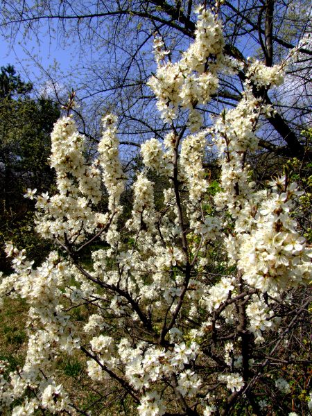 ... mit der des Schlehdorns, welcher vielerorts an Straßenböschungen wächst und hübsch weiß blüht. Seit ich das weiß, habe ich die Irisblüte noch nie versäumt.
