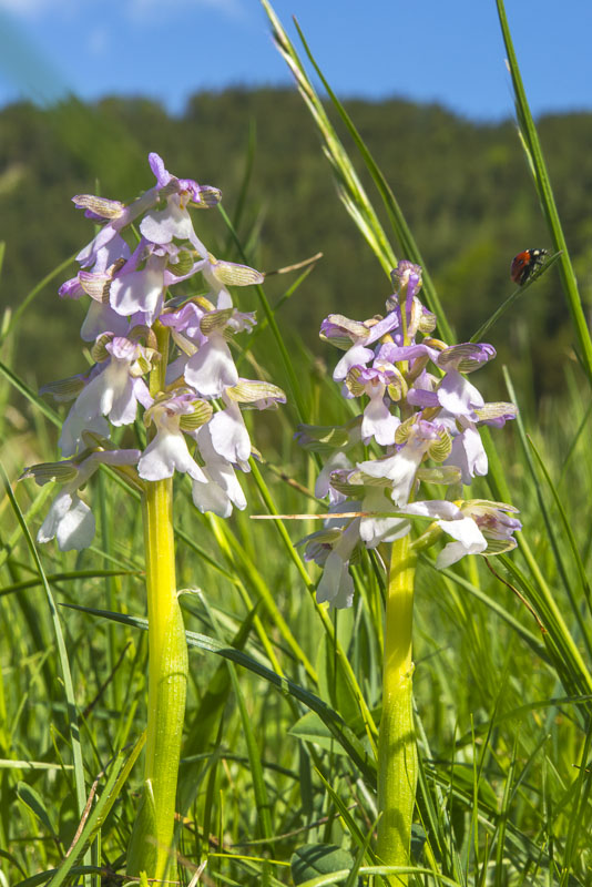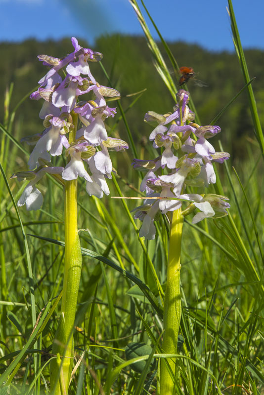 Hellere Variante des Kleinen Knabenkrauts (Orchis morio). Der Besucher auf dem Grashalm nebenan rüstet gerade zum Abflug.