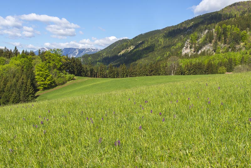 Ich fahre mit Herwig Gießwein nach Gasteil, um den beiden Orchideenwiesen im Gahnsmassiv einen Besuch abzustatten.