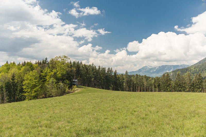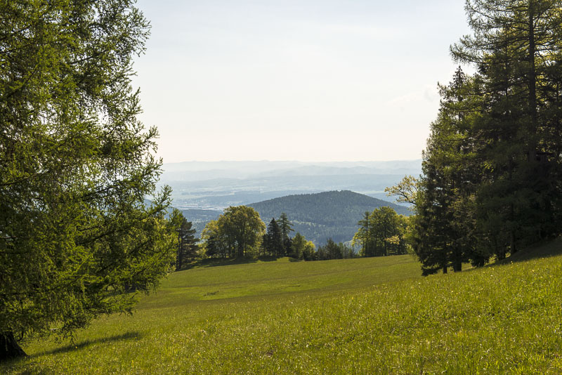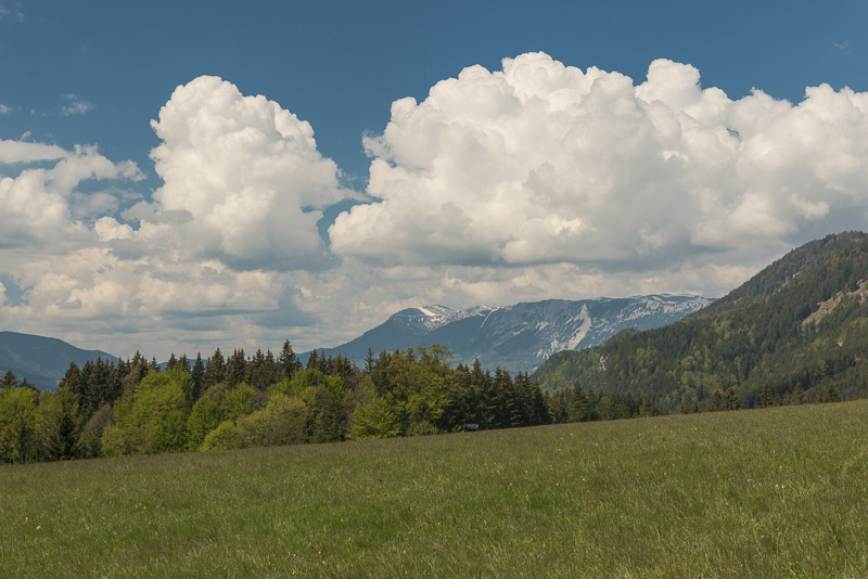 Die Gahnshauswiese, die wir von Prigglitz aus erreichen. Schöner Blick auf die Rax, ganz links die Heukuppe (2.007 m)