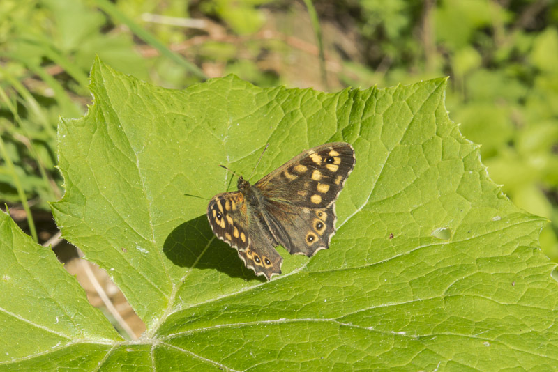 Auf einem ihrer Blätter hat sich dieses Waldbrettspiel (Pararge aegeria) niedergelassen.