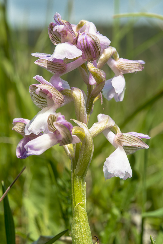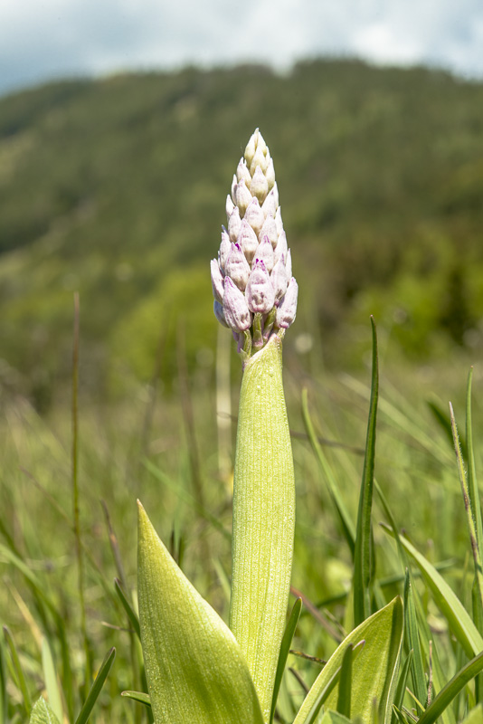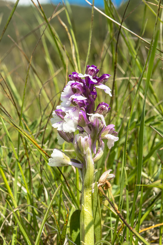 Dazwischen ein Helmknabenkraut (Orchis militaris), das noch nicht aufgeblüht ist.