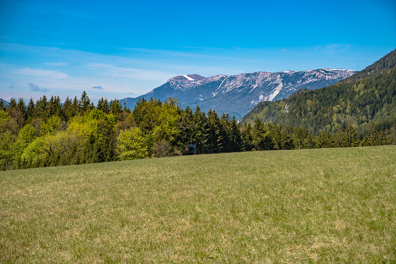 Gahnshauswiese with the view to the Rax. Extremely small amounts of snow up there as for end of April.