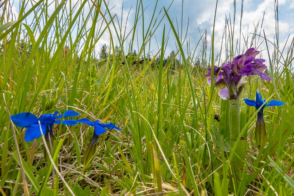 Some Spring gentians (Gentiana verna) join to the orchids.