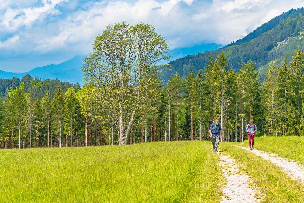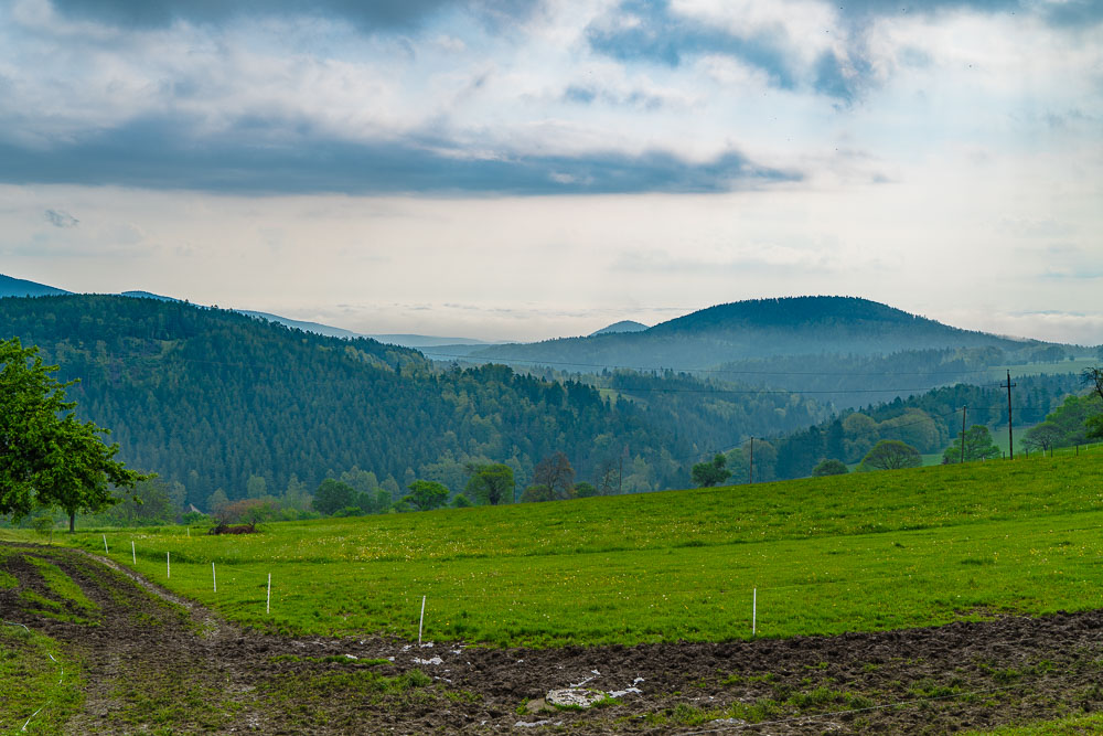 View along the meadow to the Rax massive, wrapped in clouds today.