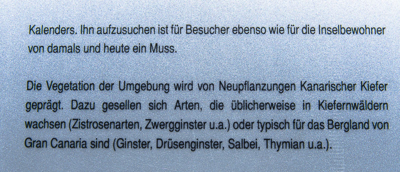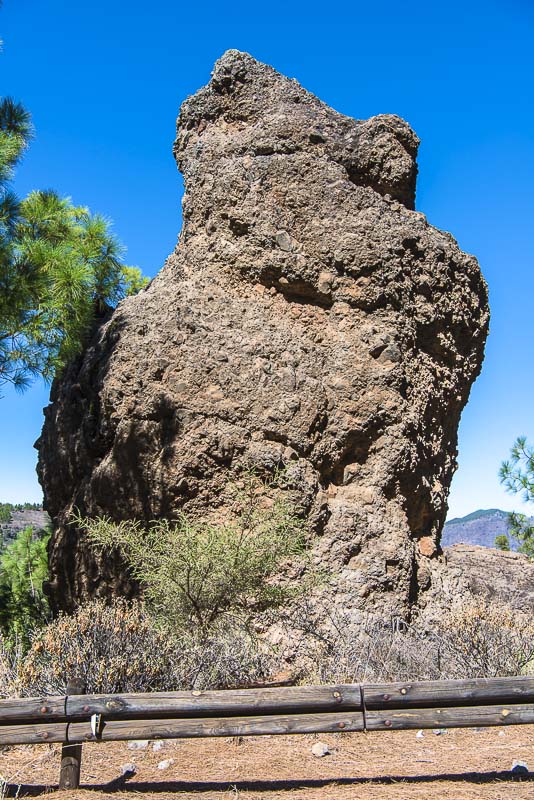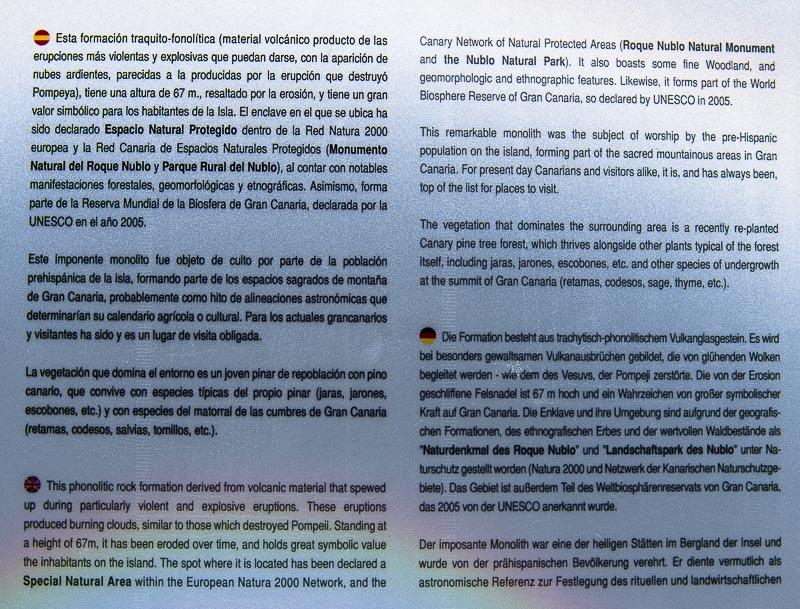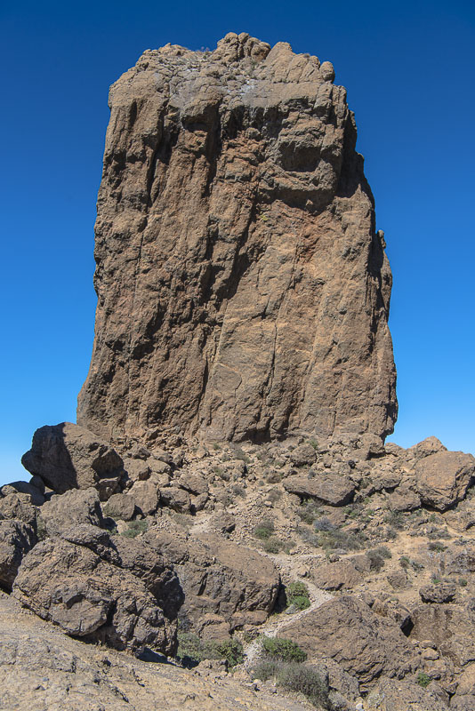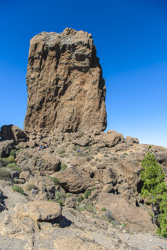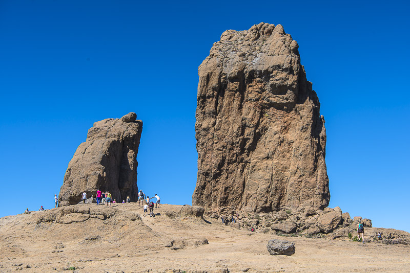Roque Nublo. Der Gipfel ist 1.813 m hoch, er ragt 65 m über das flache Felsplateau hinaus.