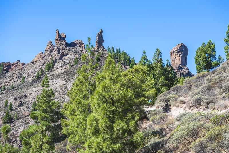 Mehrere bizarre Felsnadeln, von denen der Roque Nublo (ganz rechts) die größte ist.