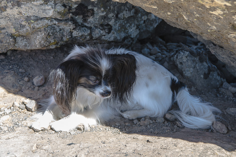 Lucy sucht Schutz vor der Sonne im Schatten eines Felsens.