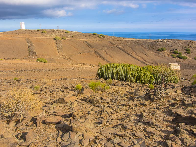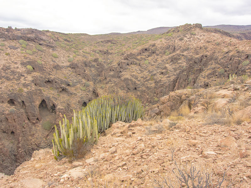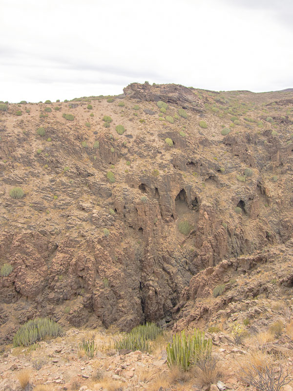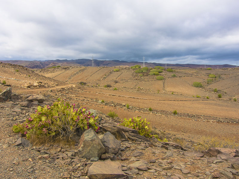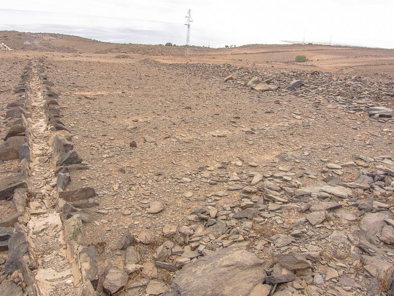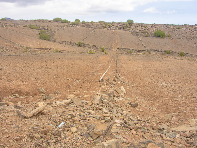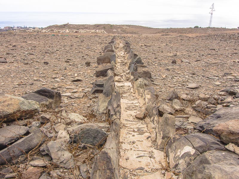 Reste alter Bewässerungskanäle zeugen von der Zeit, als es hier in den Barrancas (= Schluchten) noch ganzjährig Wasser gab, das man ableiten und zur Bewässerung der Felder verwenden konnte. Mittlerweile ist Wasser rar geworden., außerdem wird sämtliches Wasser weiter oben gesammelt und in Leitungen an den Küstenstreifen transportiert - zum Bewässern der Gärten und Golfplätze. Hier oben gibt es nur noch Wüste.