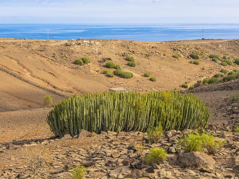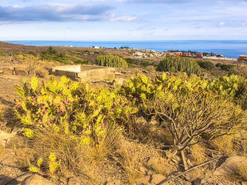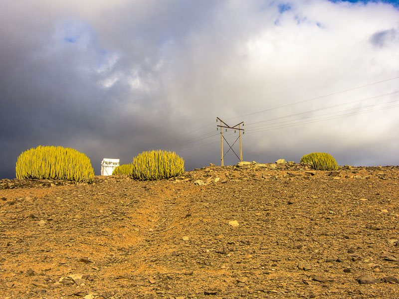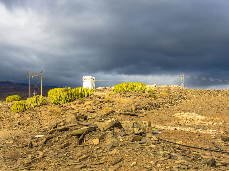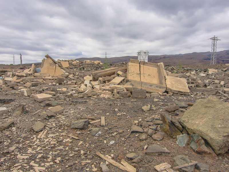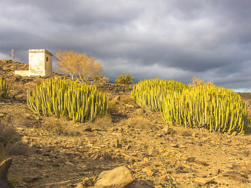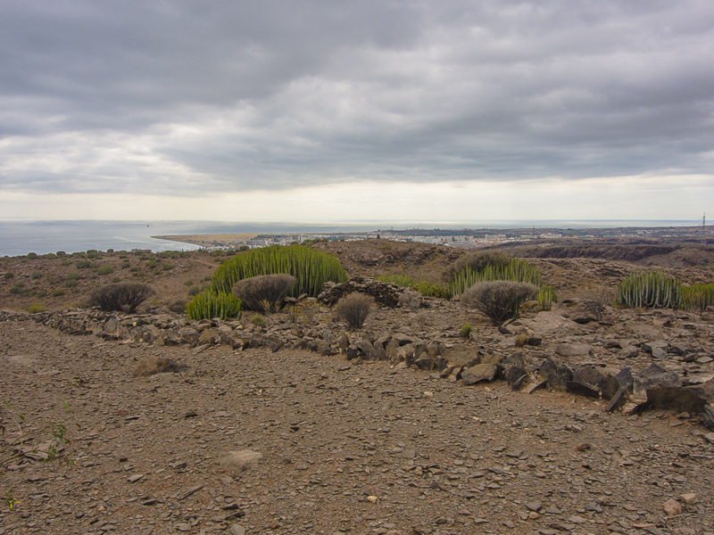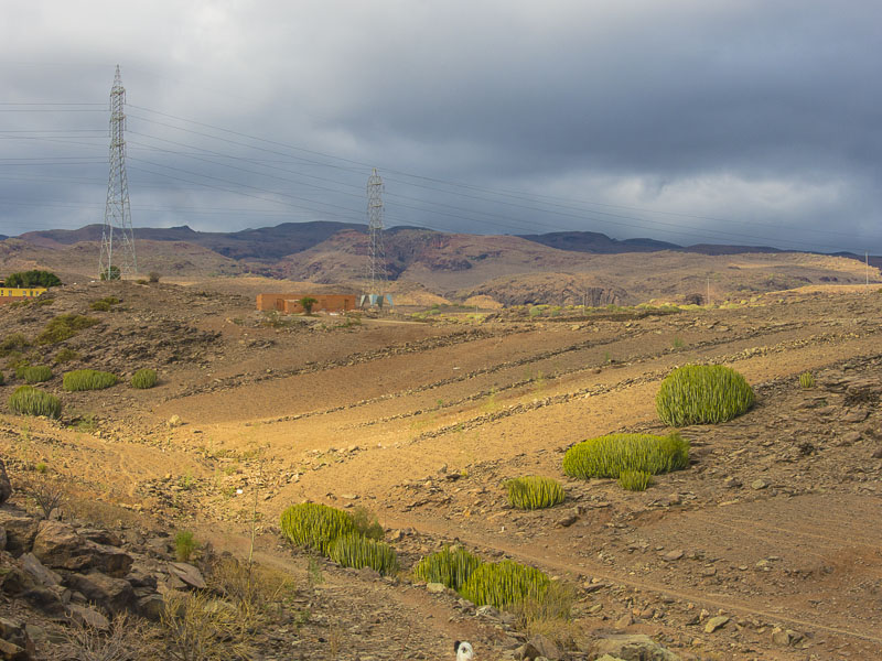 Reste alter Bewässerungskanäle zeugen von der Zeit, als es hier in den Barrancas (= Schluchten) noch ganzjährig Wasser gab, das man ableiten und zur Bewässerung der Felder verwenden konnte. Mittlerweile ist Wasser rar geworden., außerdem wird sämtliches Wasser weiter oben gesammelt und in Leitungen an den Küstenstreifen transportiert - zum Bewässern der Gärten und Golfplätze. Hier oben gibt es nur noch Wüste.