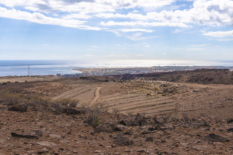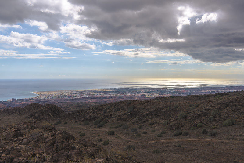 Ich steige weiter hinauf und erreiche schließlich eine Höhe von 465 m (laut Google Earth). Panoramabild der Südküste von Gran Canaria bei Maspalomas. Hierher oder ins Bild klicken für eine größere Darstellung.