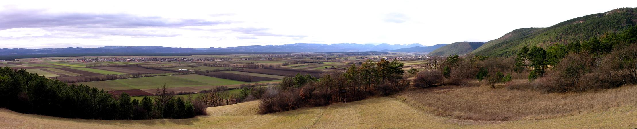 Panorama des südlichen Wiener Beckens, ganz rechts der Semmering.