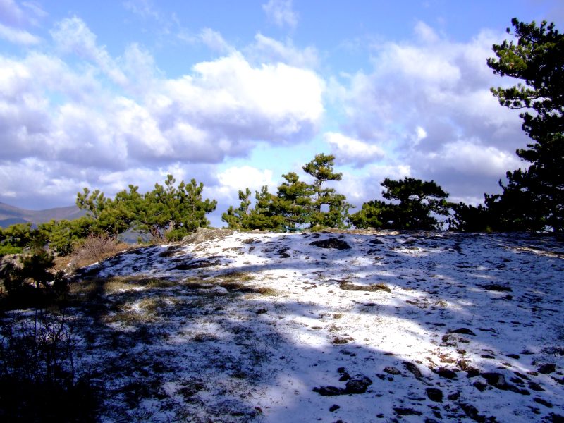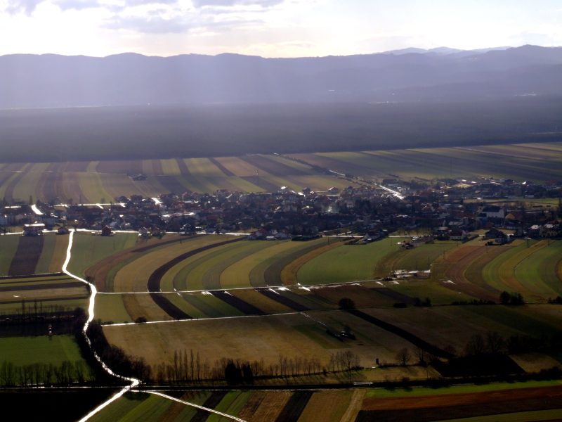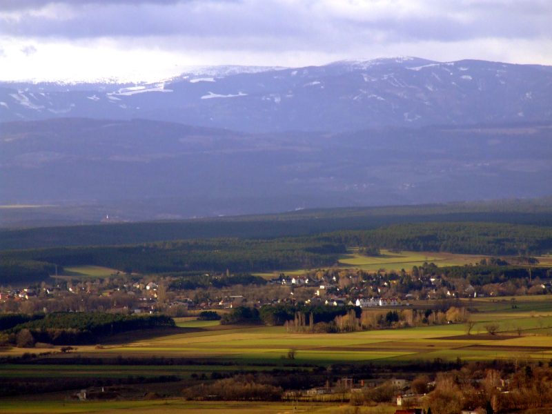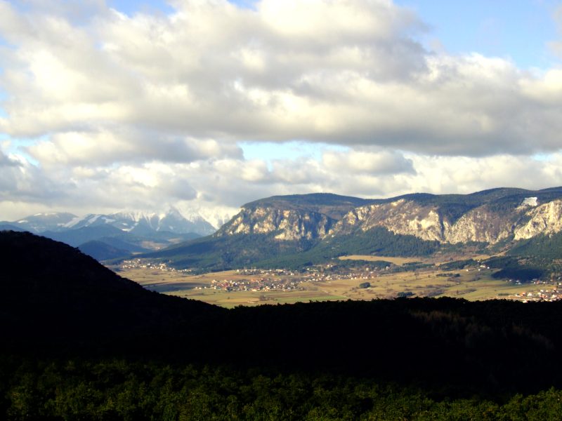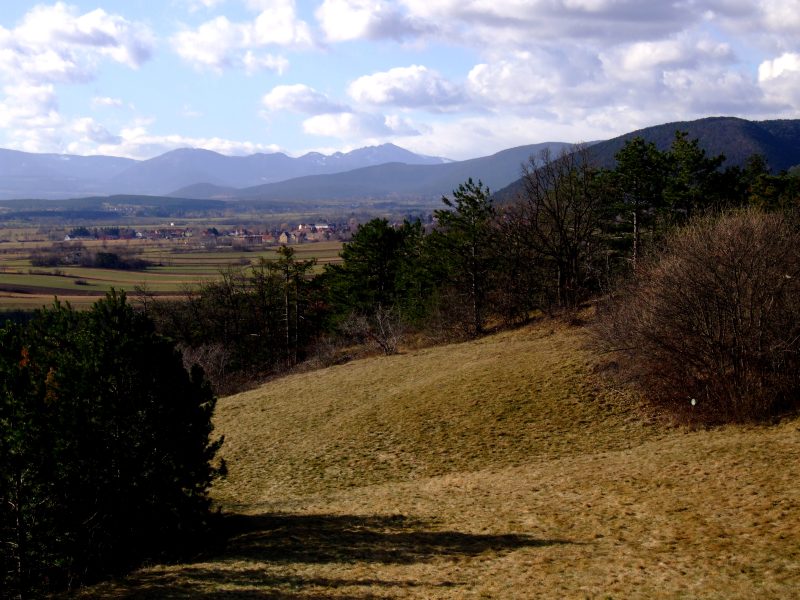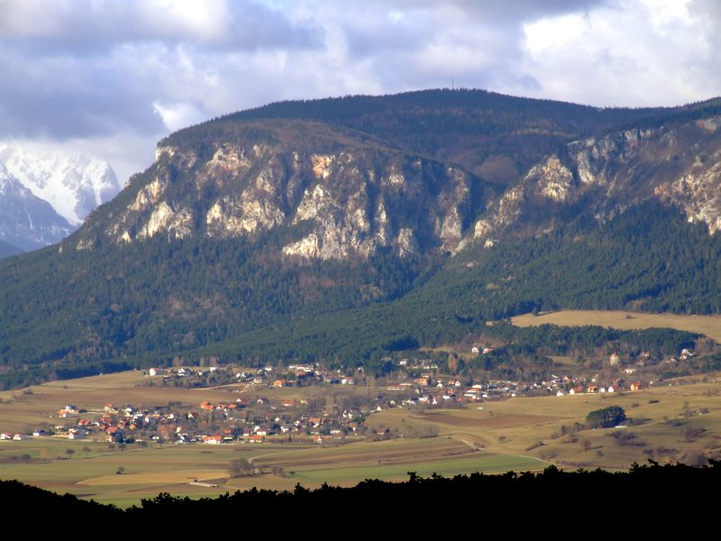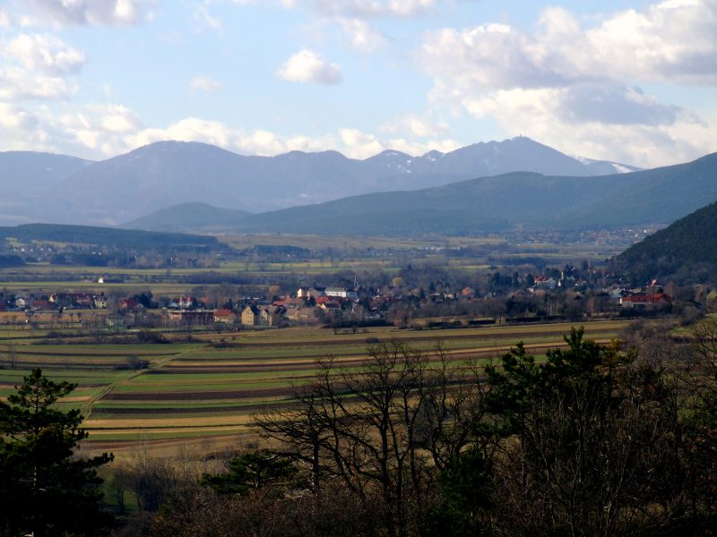 Wieder am Fuß des Gebirgszuges, Blick über Winzendorf zum Semmering, rechts die Schipiste, die aufgrund des Kunstschnees natürlich weiß ist.