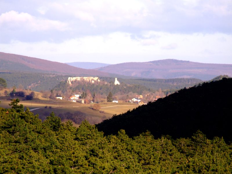 Durchblick zur Ruine Starhemberg, davor Dreistetten