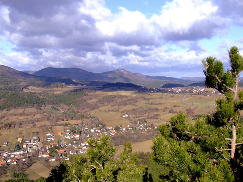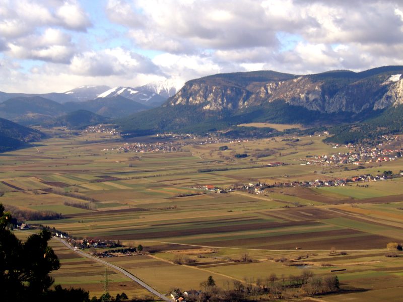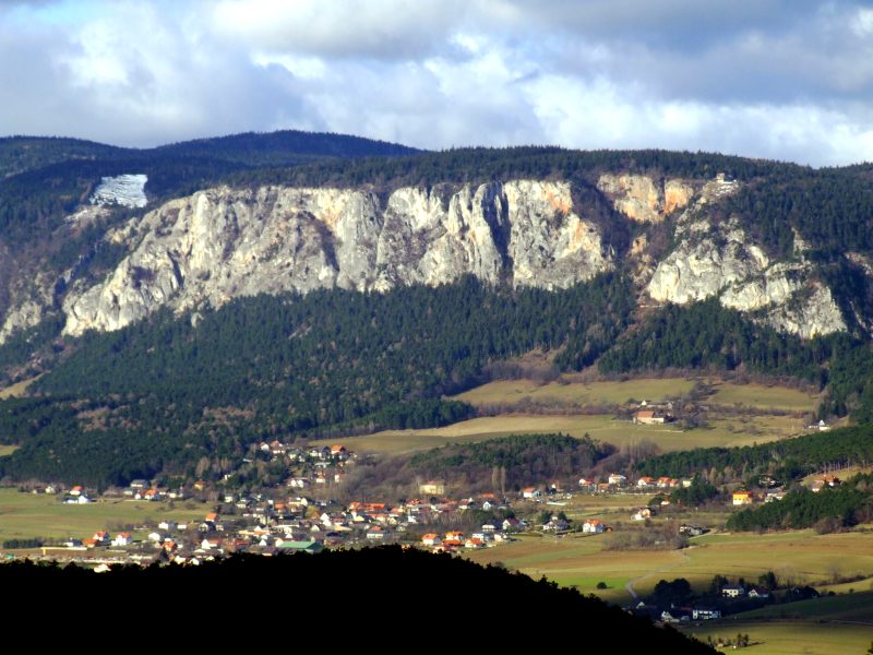 Muthmannsdorf (links) und Dreistetten (rechts hinten), links dahinter der Hohe Mandling (967 m)