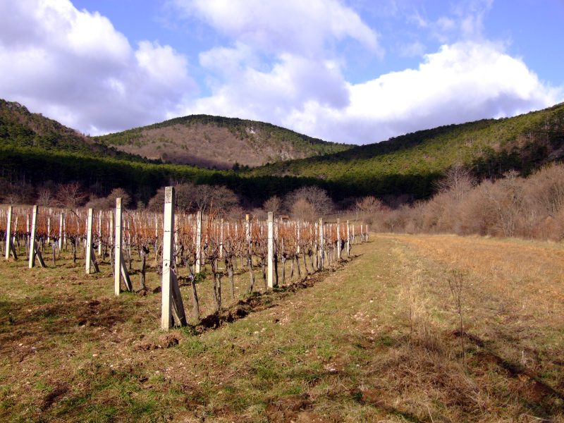 Weingärten ziehen hinauf zu den Fischauer Bergen, in der Mitte der Grössenberg, wo ich gerade oben war.