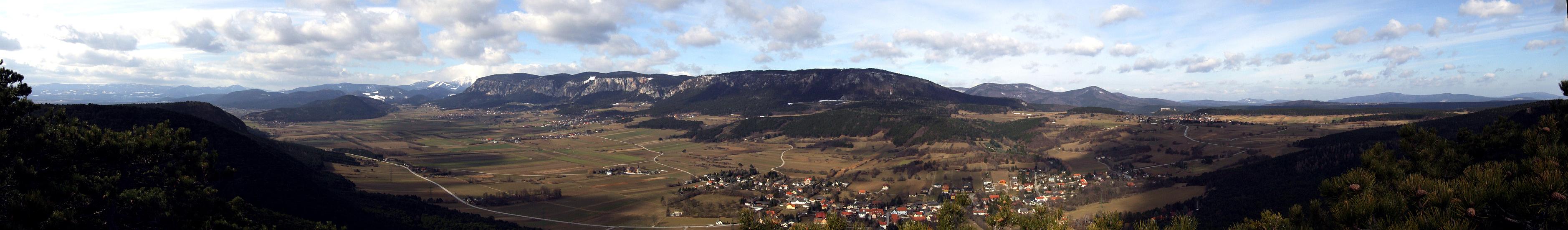 Panorama vom Gipfel des Grössenbergs: ganz links Wechsel/Semmering, dann Kienberg, Krumbachstein, Schneeberg, Hohe Wand, Muthmannsdorf, ganz rechts Dreistetten.