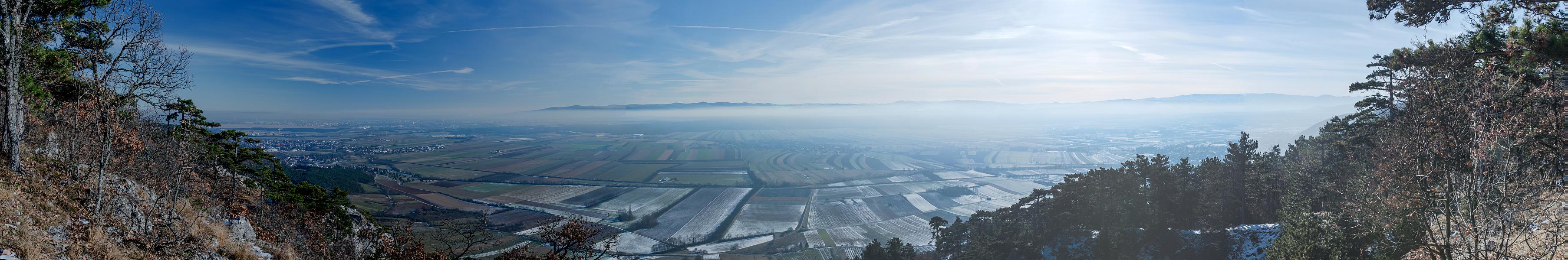 Panoramablick von der Oberkante des Muthmannsdorfer Marmorsteinbruchs über das südliche Wiener Becken. Am Horizont links Wiener Neustadt, dann das Rosaliengebirge, rechts die Wechselregion.