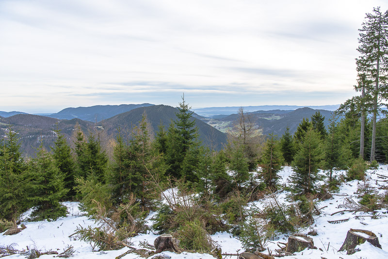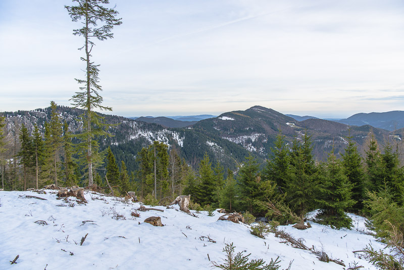 Nach einer Überschreitung des Kamms mit dem Gipfel steigen wir am westlichen Teil des Hangs ab, der dort flacher ist und zwischendrin auf einem Kahlschlag einen herrlichen Ausblick auf den Schneeberg bietet, ...