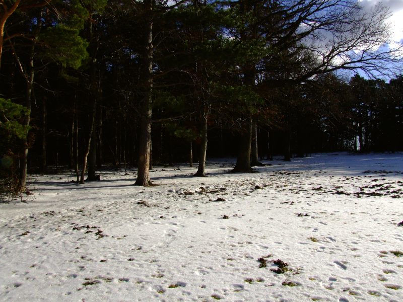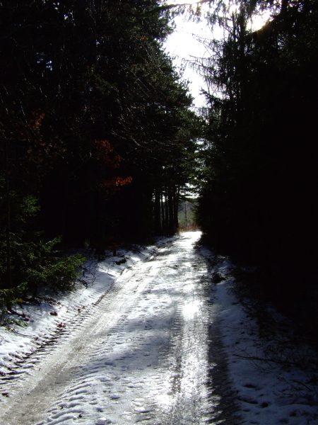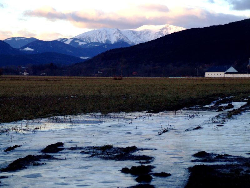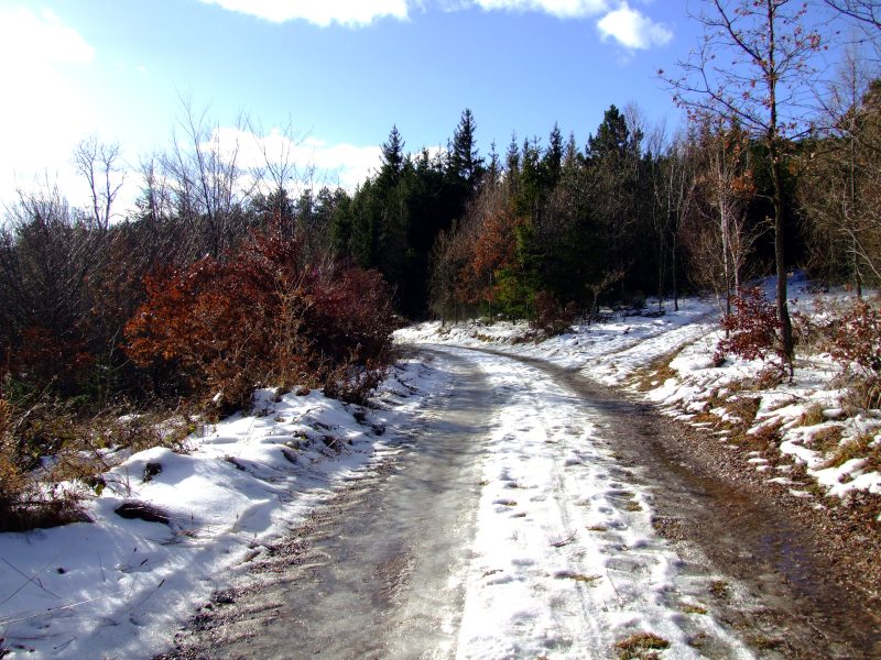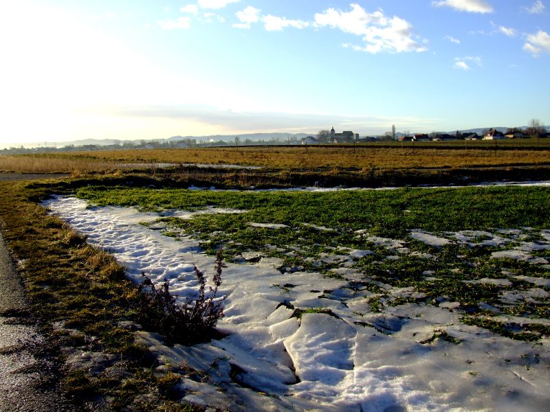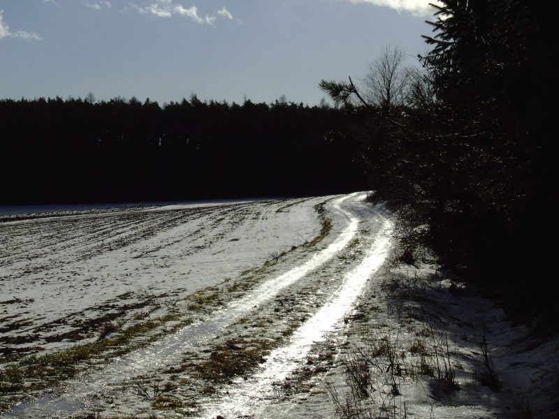 Recent thaw has swept off the thin snow carpet, but the ground soil is still frozen from several weeks of continuous frost. A clear night did the rest, so partially molten snow sheets present as ice.