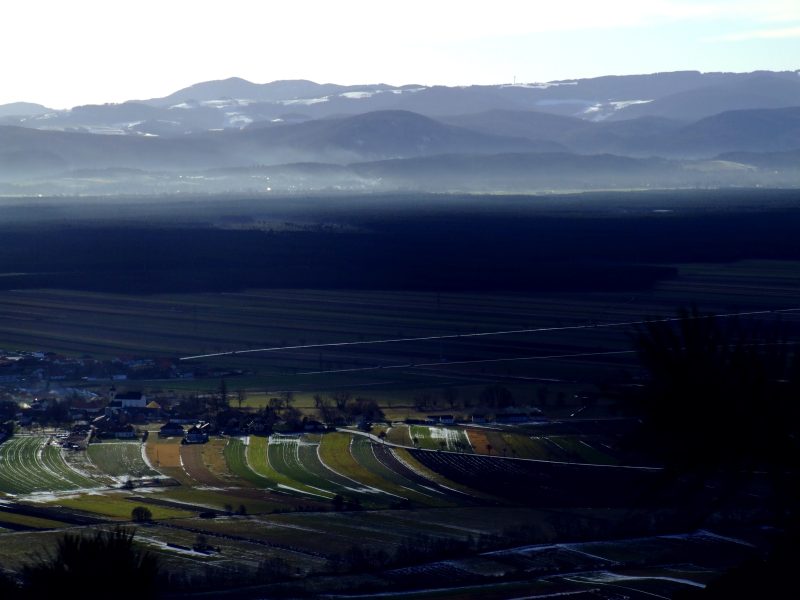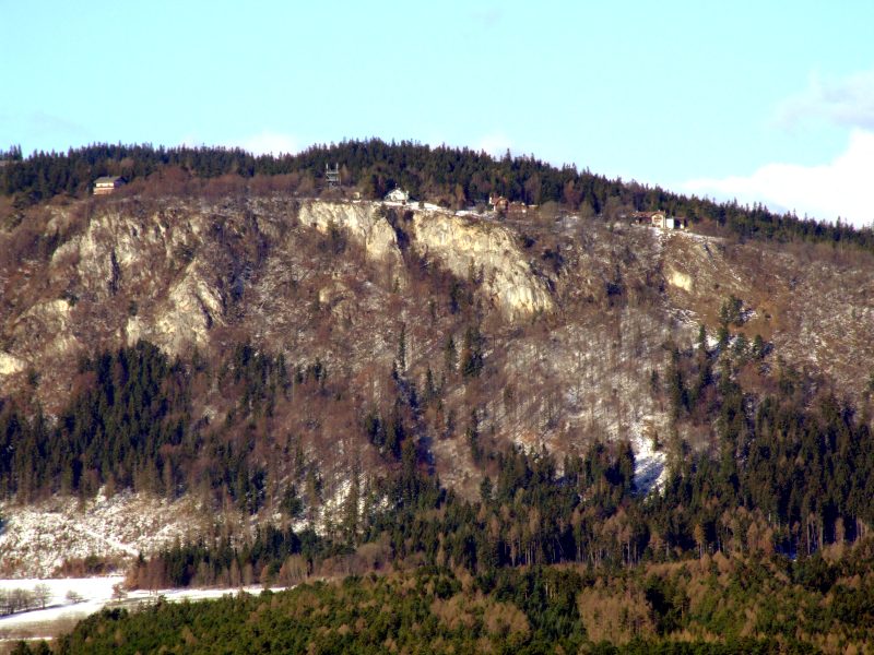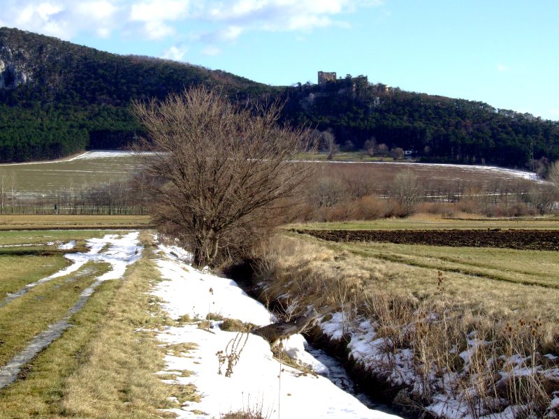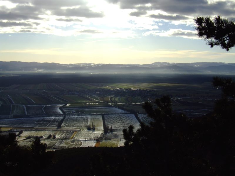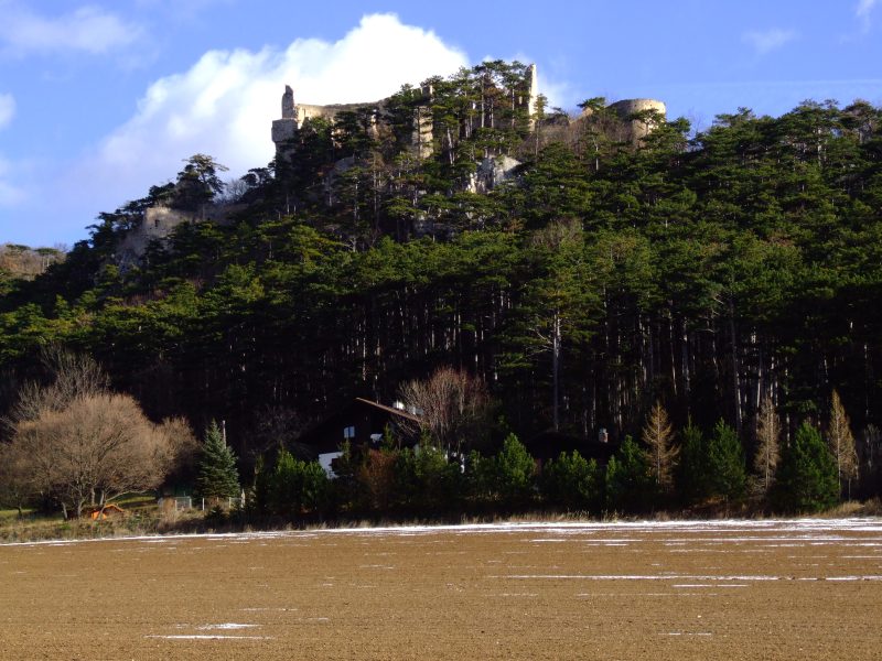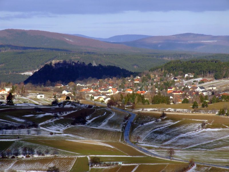 Dreistetten, and behind, in shadow now, ruin Starhemberg. In the background to the left is Hoher Mandling.