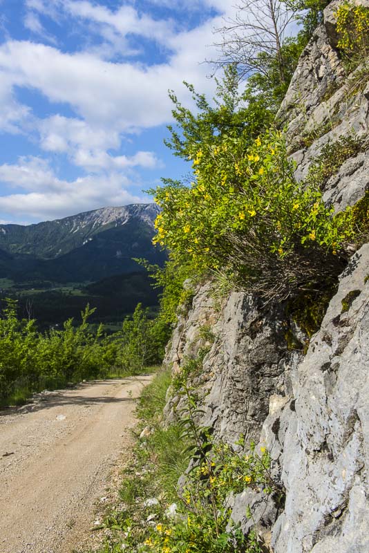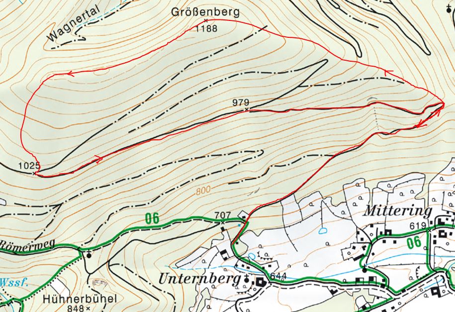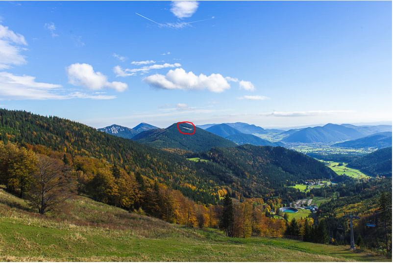 North of Puchberg, on the opposite side of the Puchberg valley, there is a forested ridge with its highest point named Größenberg (1.188 m). Maybe the forest is the reason that nearly nobody knows this area. But if there is a gap between the trees, you should have a gorgeous view to the Schneeberg. For more than a year I considered to check this possibility.