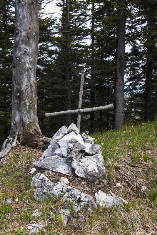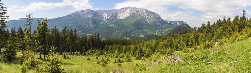 The place gives you the best possible view of Schneeberg: From the Hengst to the left to the Fadensattel and Kuhschneeberg to the right. Click here or into the picture for a larger display.