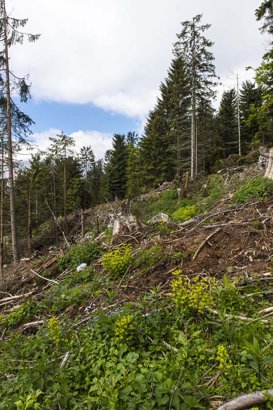 So, I decide to climb the summit via the forest road and the ridge, where the slope isn´t that steep and search for this grassy path.