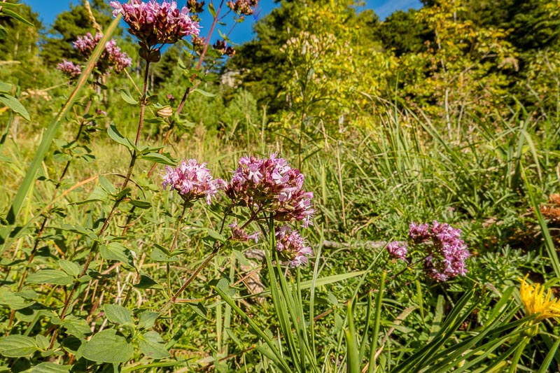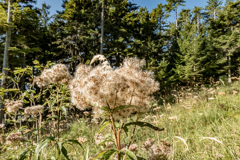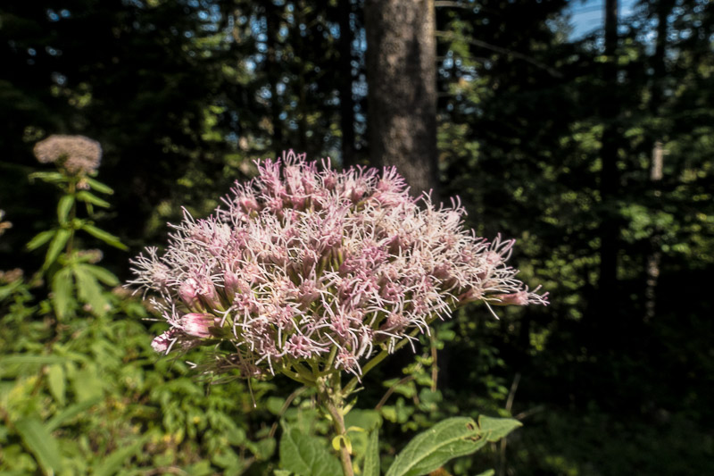 I opt for the more knee-saving descent via the forest road. In the cool shadow, a very last flowering exemplar of hemp-agrimony (Eupatorium cannabinum)