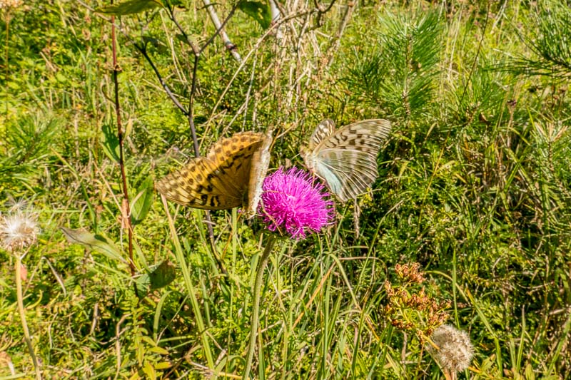 This Alpine thistle (Carduus defloratus) has two visitors - a pair of Silver-washed fritillary (Argynnis paphia).