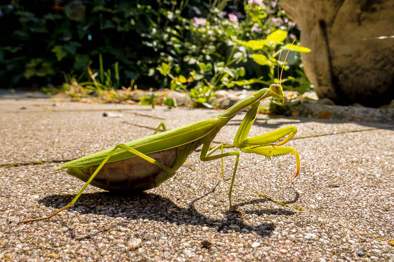 Coming home, there is a special visitor in my garden: a European mantis (Mantis religiosa)
