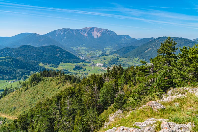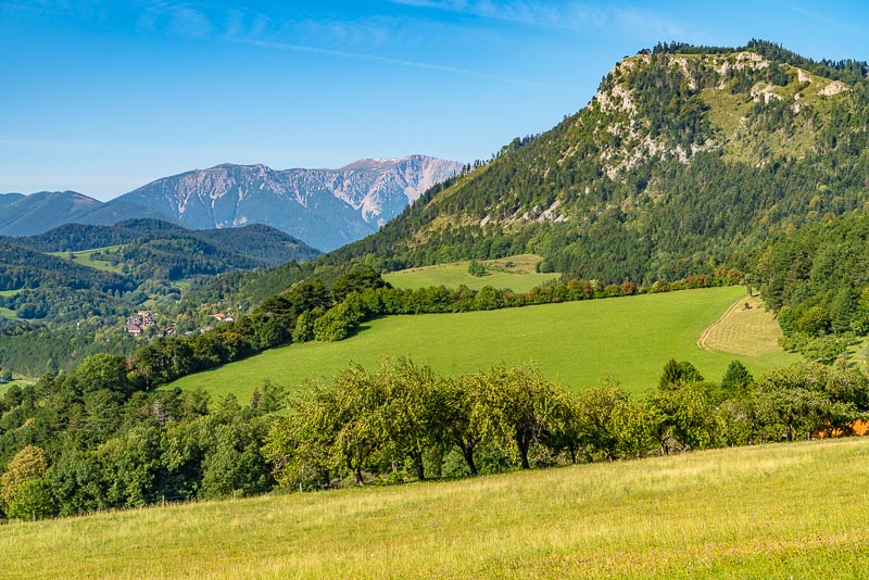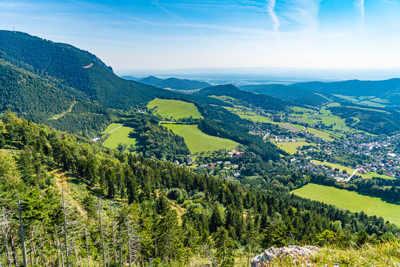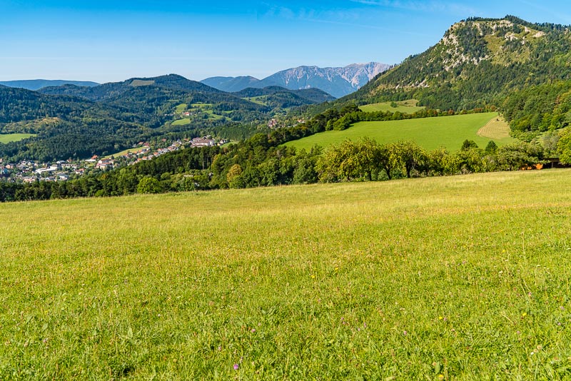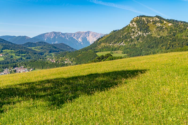Grünbach in the hollow, with Schneeberg behind and far right the Geländ, the southwestern end of the Hohe Wand.