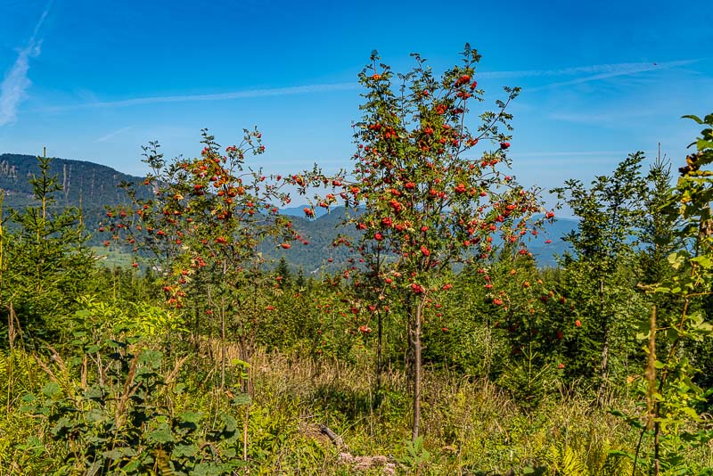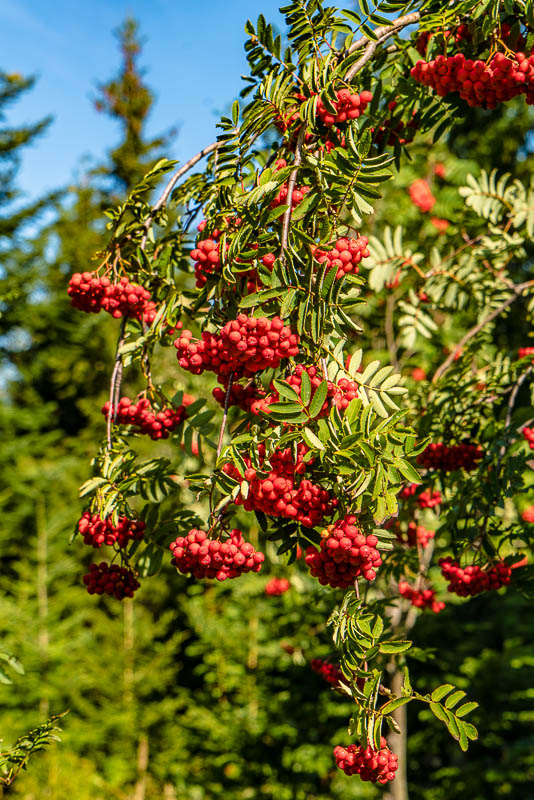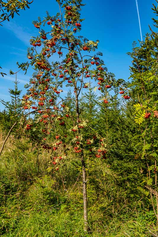Wonderful rowan (Sorbus aucuparia) along the path - full with fruits this year, so that the branches are hanging down.