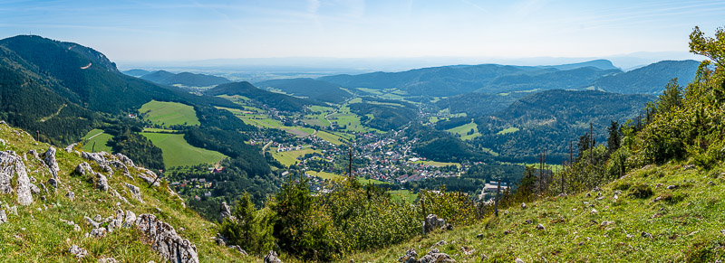 Panoramic view to Grünbach, as seen from the Geländ. Hohe Wand with the Plackles to the left. Click here or into the picture for a larger display.