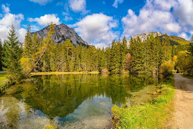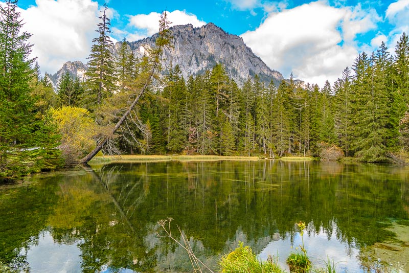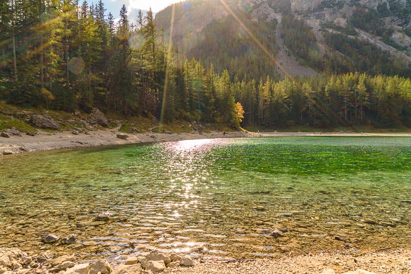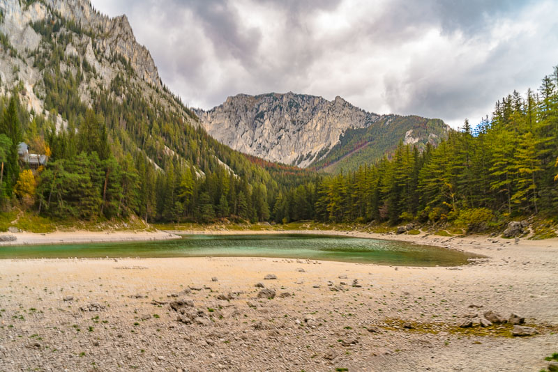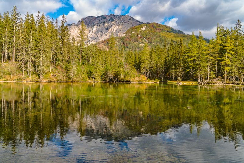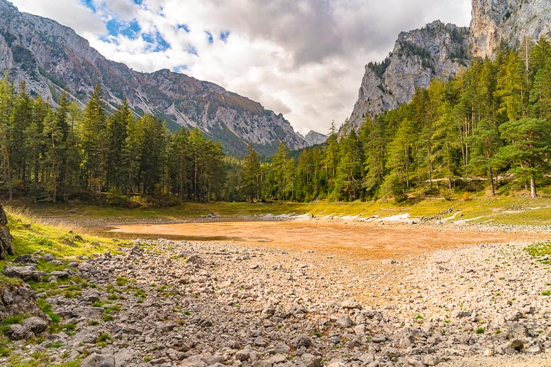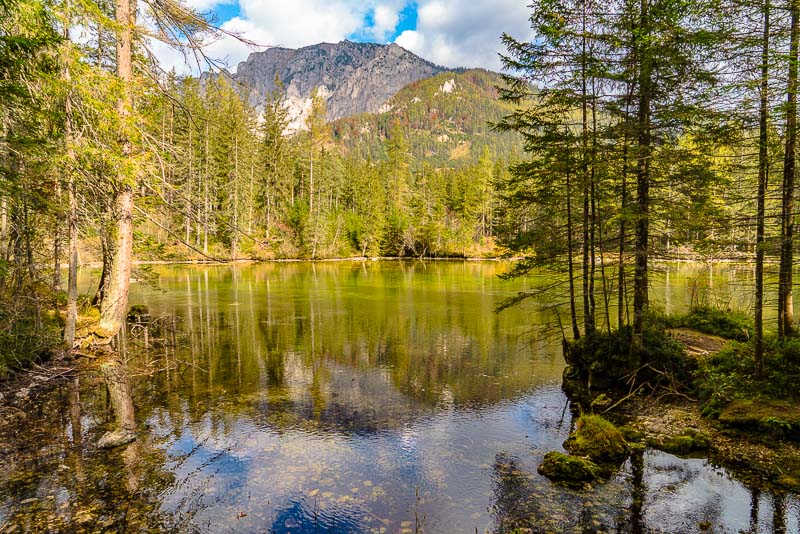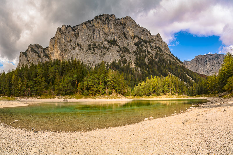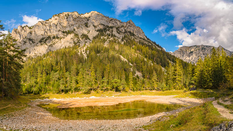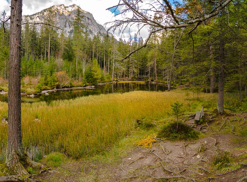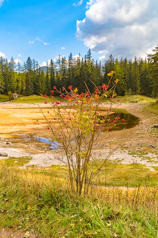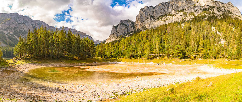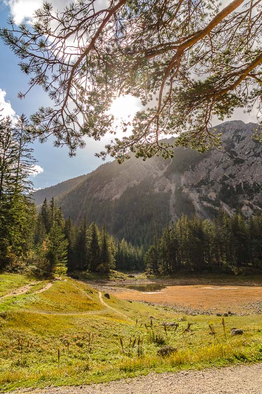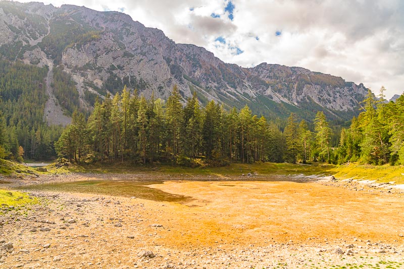 After another 10 minutes we reach the Grüner See, which at first sight looks a bit disappointing due to its very low autumnal water level.